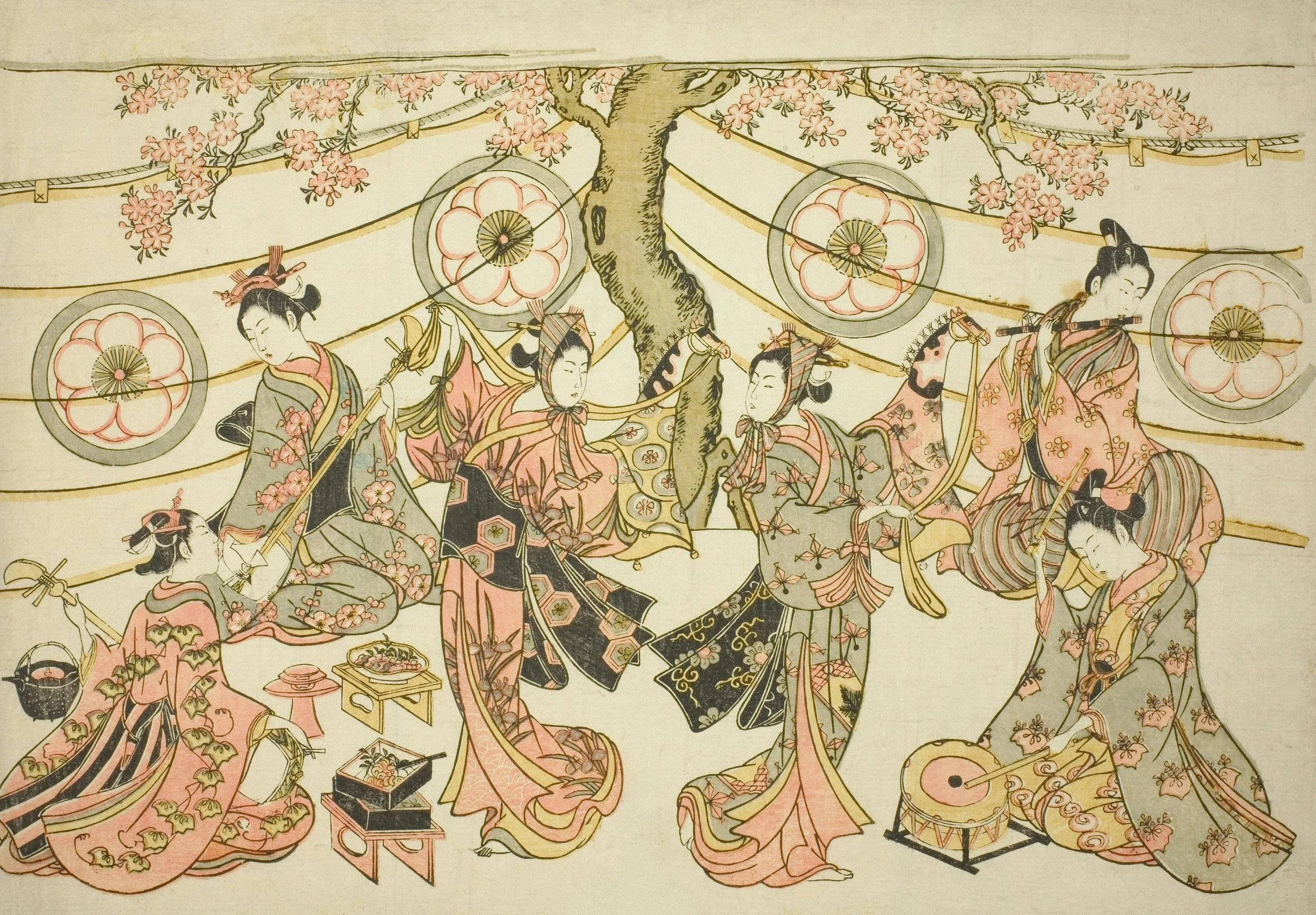 The soft pink was derived from the blush applied to the cheeks, the light blue from intricate kimono patterns, and the warm yellow from ornamental hairpieces and fabric accents.