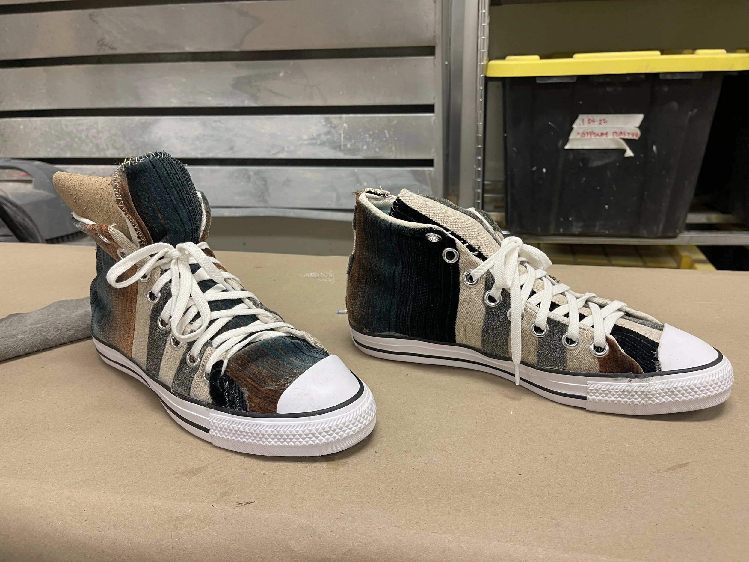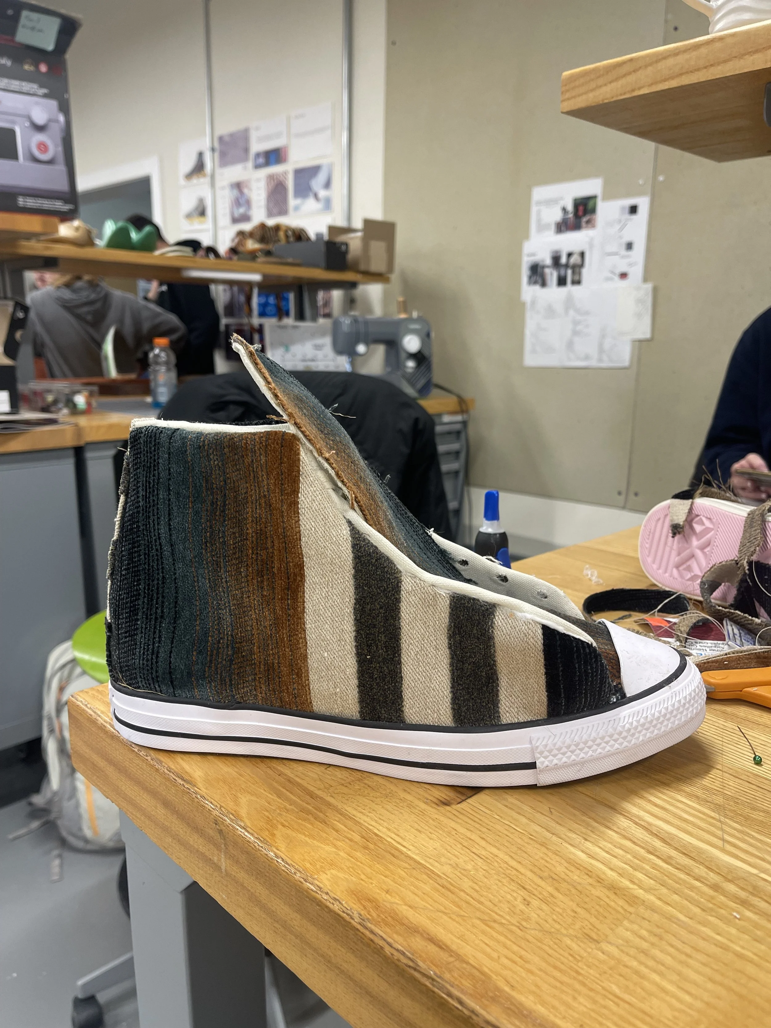 From there I used my own fabric, after being traced and cut, to re-sew the upper, making sure to follow the original shape while adding subtle material changes. Once the new upper was stitched together, I wrapped it around a shoe last and used a vacuum seal and glue to attach it securely back to the sole.