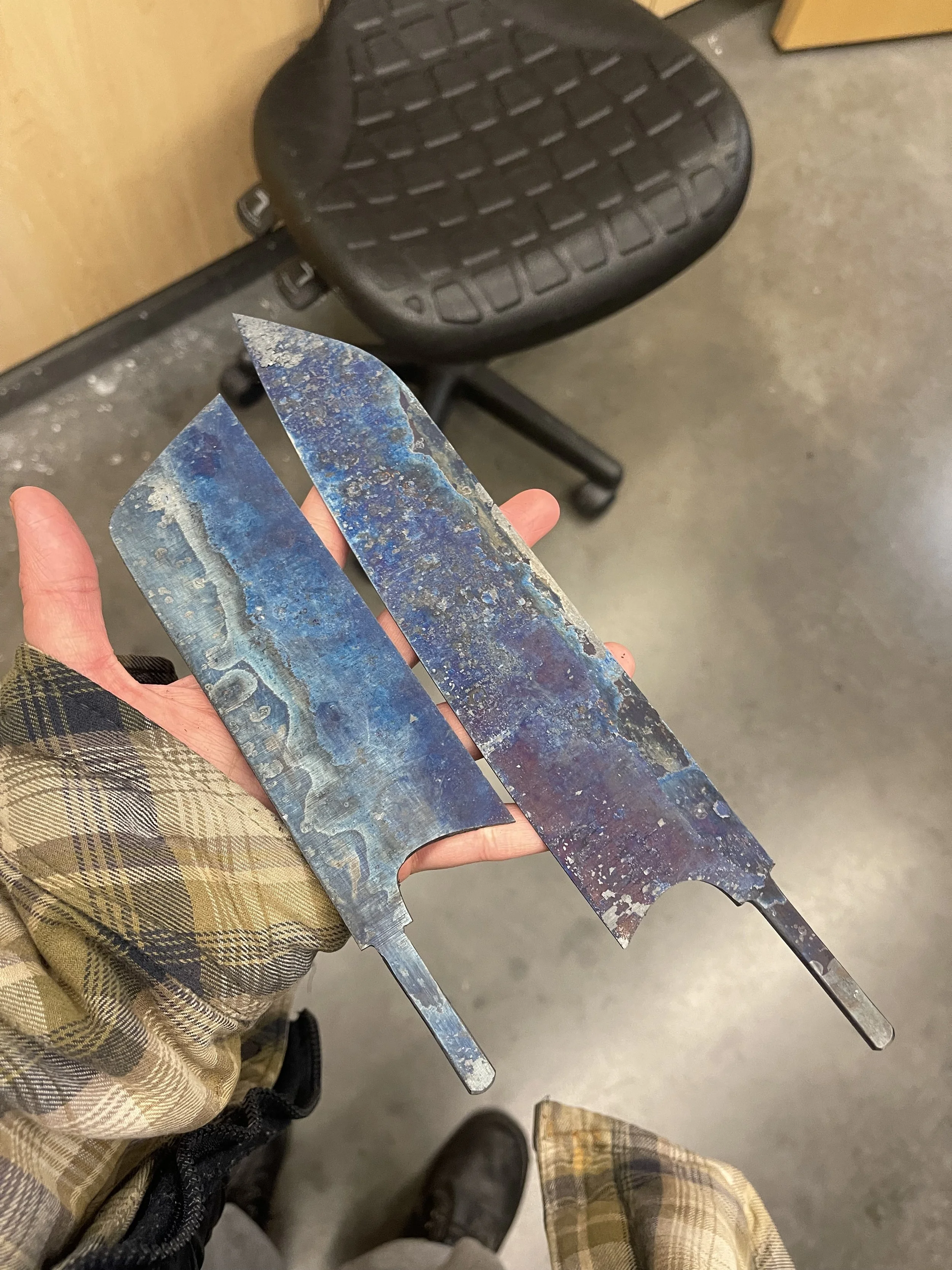 For the knives, I cut the blade profiles from O1 tool steel, heat-treated them for hardness, and sanded each blade to achieve the desired edge and angle. The knife handles were crafted from aluminum, which I carefully sanded and shaped for a smooth, balanced fit in the hand.