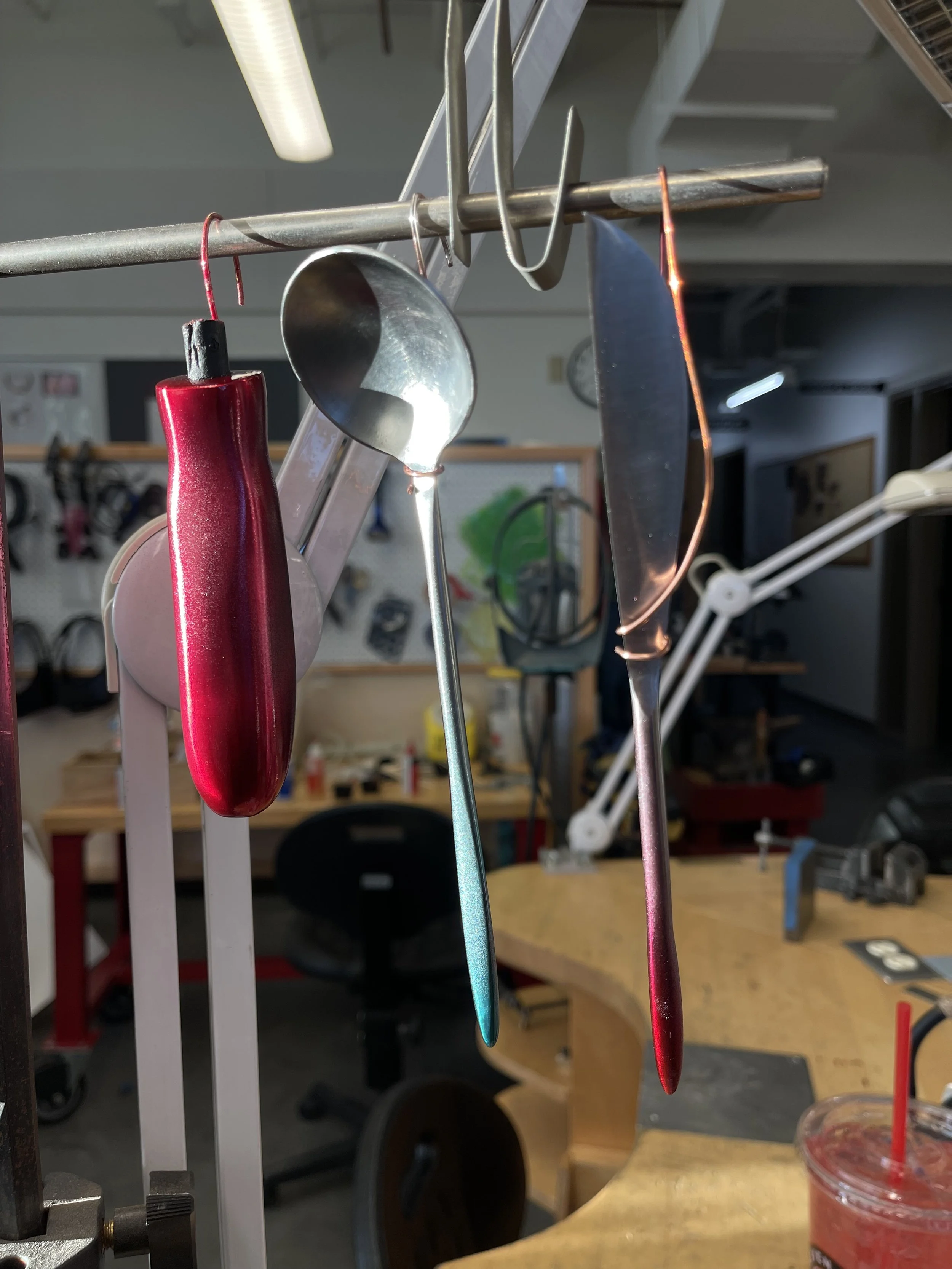 After completing my research, sketches and early prototyping, I began fabricating the flatware and tea scoop. Using sheet steel, I cut the desired shapes and created custom dies to form the spoon and scoop bowls with a hydraulic press. Each handle was shaped from steel rod — heated, hammered, and sanded into a rounded, ergonomic form for comfortable use.